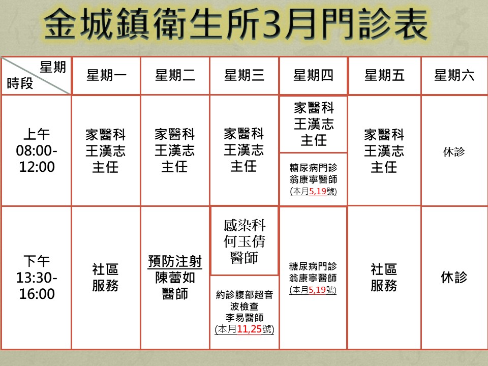 *註:上午門診時間早上08點至中午12:00分,掛號時間08:00至11:30分止 ;
